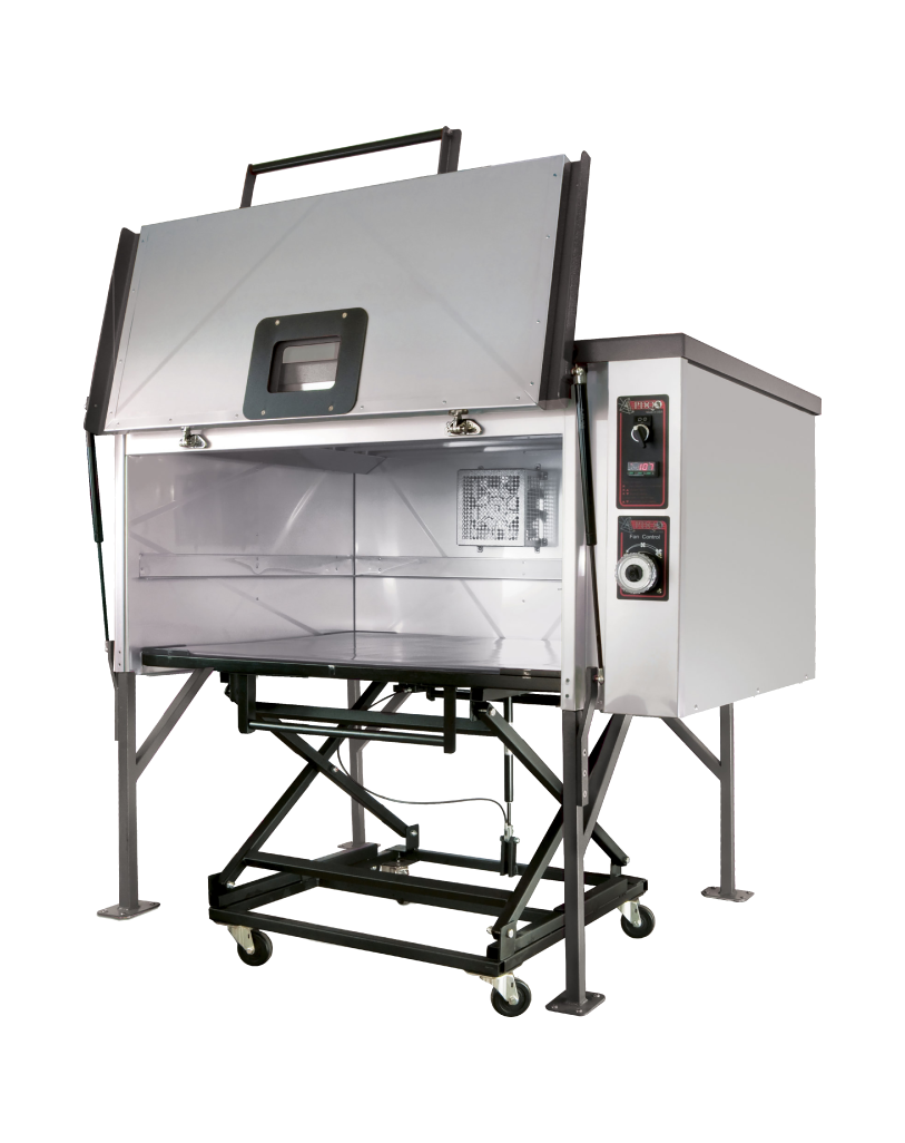 La bandeja incluye una cubierta de teflón® ajustada, está montada sobre ruedas y se puede llevar hasta el área de vacío. Se acabaron las quemaduras en los brazos y el intento de encontrar un lugar para colocar el plástico caliente.